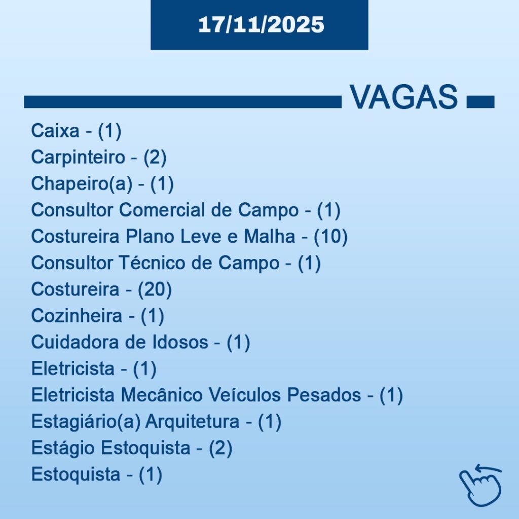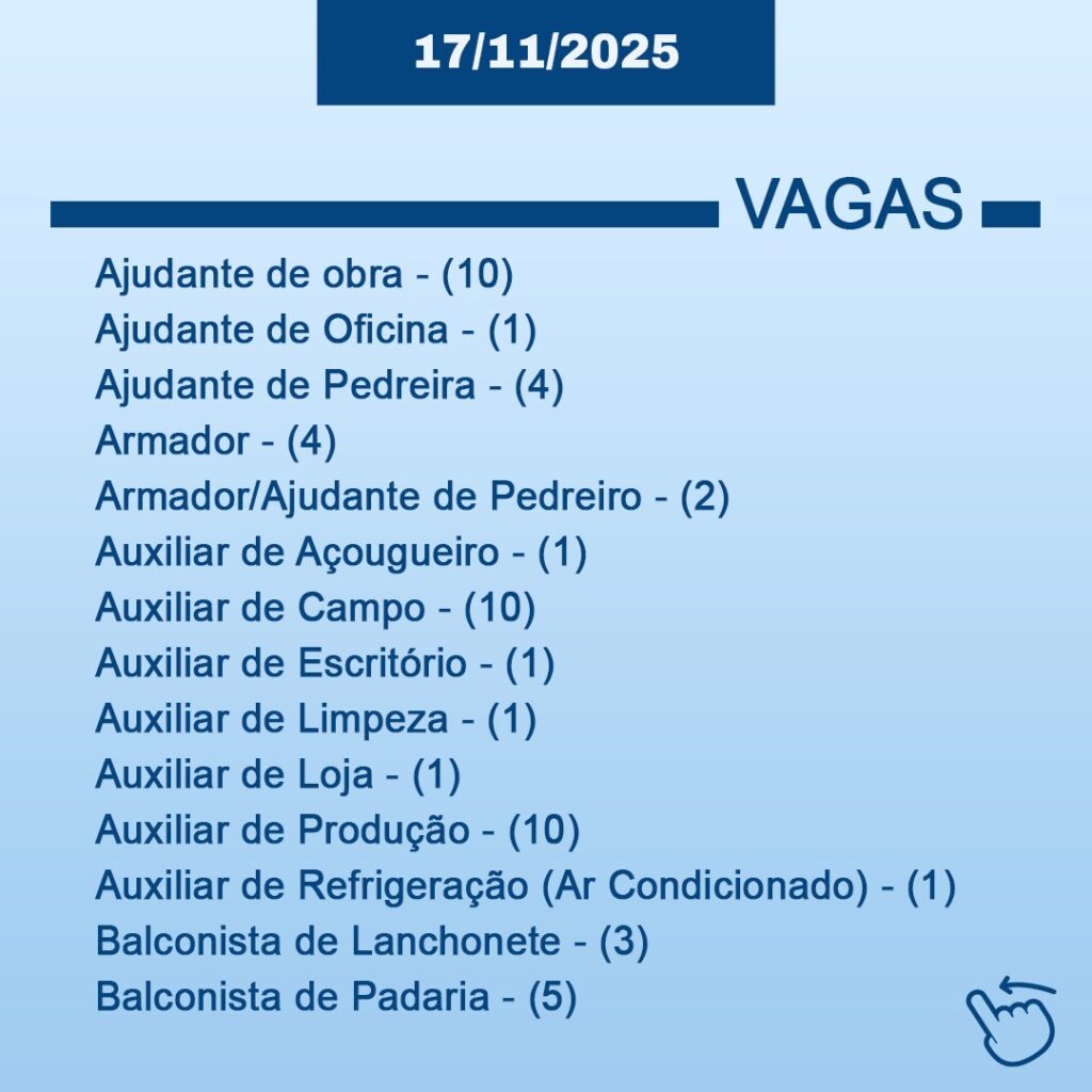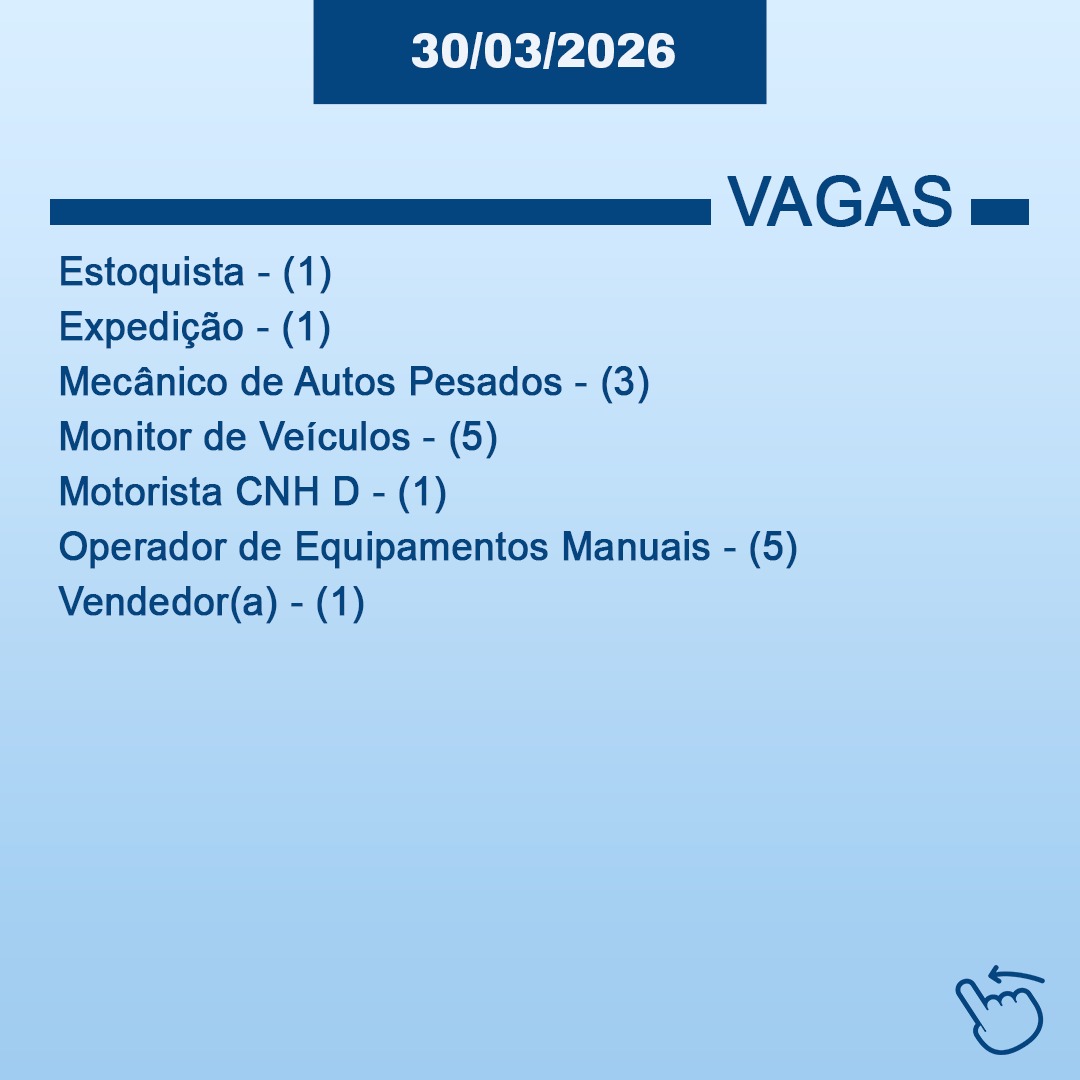 OBS: ℹ A Secretaria de Desenvolvimento Econômico atualiza as vagas semanalmente em colaboração com as empresas parceiras. Divulgamos as oportunidades, porém não temos responsabilidade sobre as entrevistas ou contratações, que são conduzidas pelas próprias empresas.