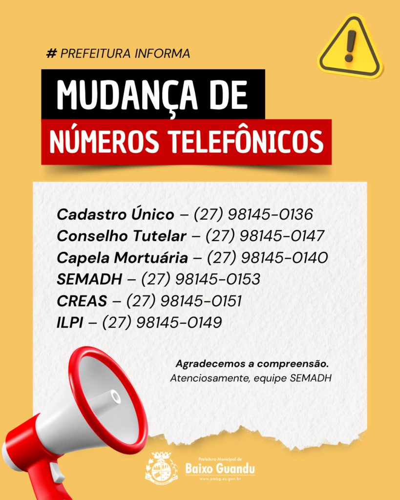 A Prefeitura Municipal de Baixo Guandu, por meio da Secretaria Municipal de Assistência Social e Direitos Humanos (SEMADH), comunica à população que houve uma alteração nos números telefônicos de alguns serviços essenciais. A medida visa melhorar a comunicação e o atendimento à comunidade.