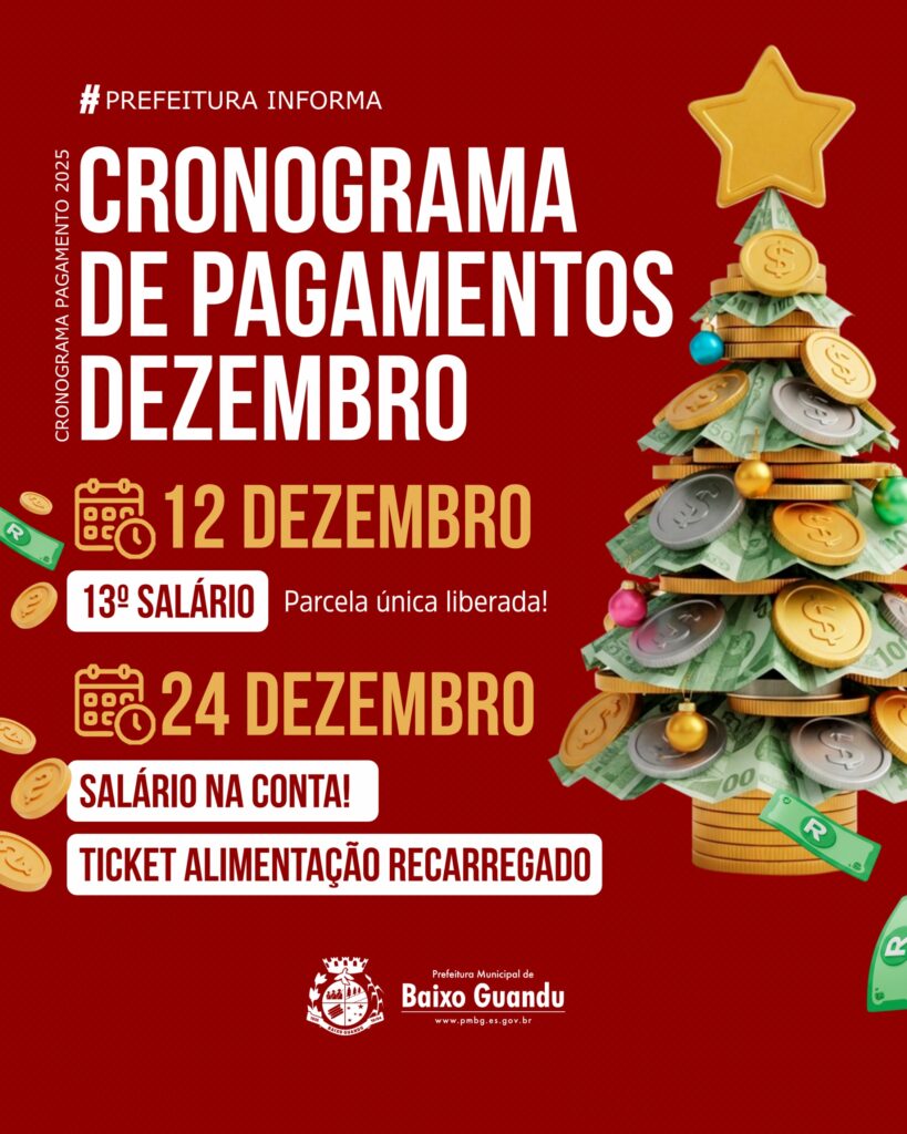 A Prefeitura Municipal de Baixo Guandu, por meio da Secretaria de Administração e Finanças, informa o cronograma especial de pagamentos referente ao mês de dezembro, preparado para garantir mais tranquilidade e organização financeira aos servidores municipais neste fim de ano.